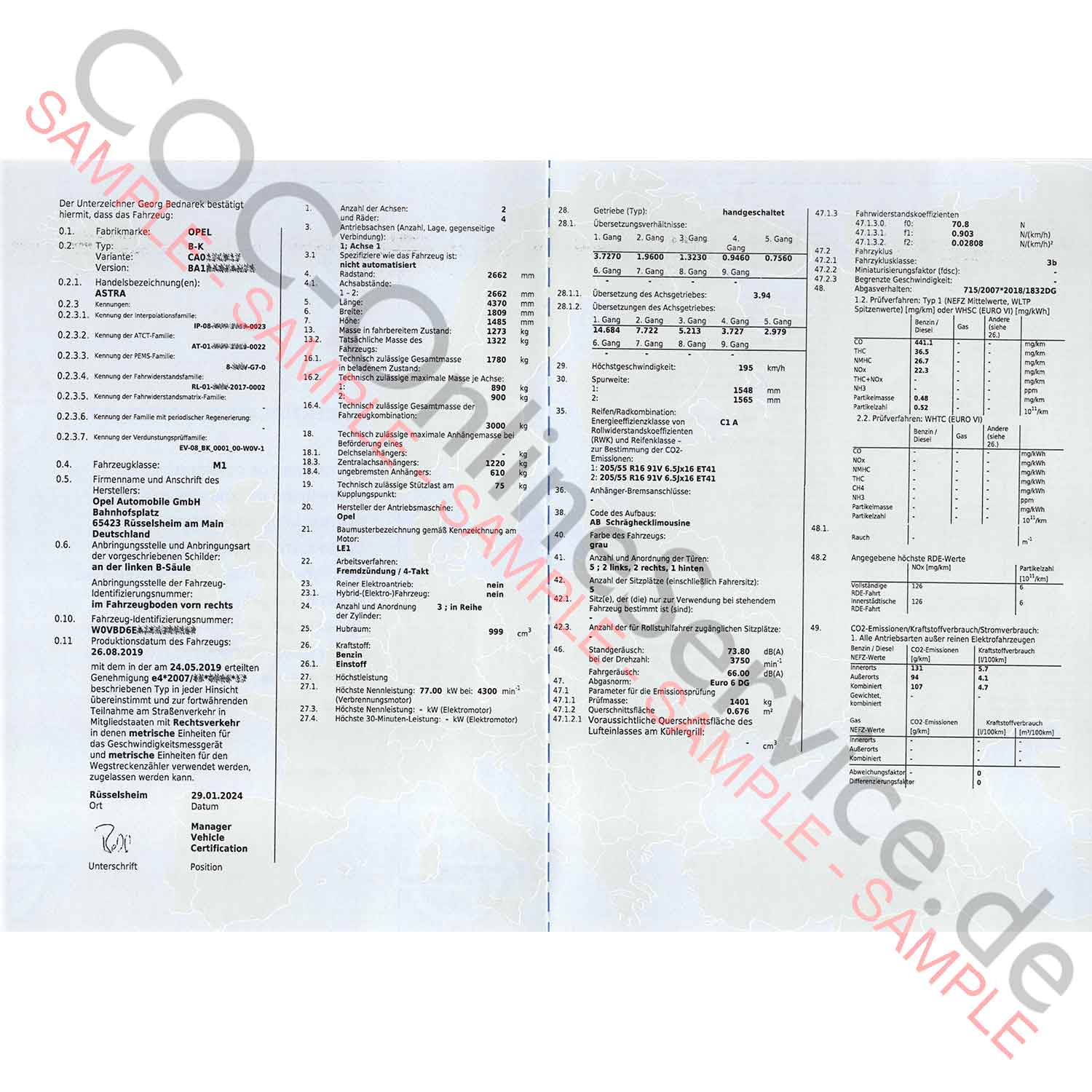 Si la livraison d'un COC pour votre numéro de châssis (VIN) n'est pas possible, par exemple parce que le véhicule est trop ancien ou n'a pas été construit pour le marché européen, nous annulons immédiatement la commande et remboursons l'intégralité du prix d'achat.
