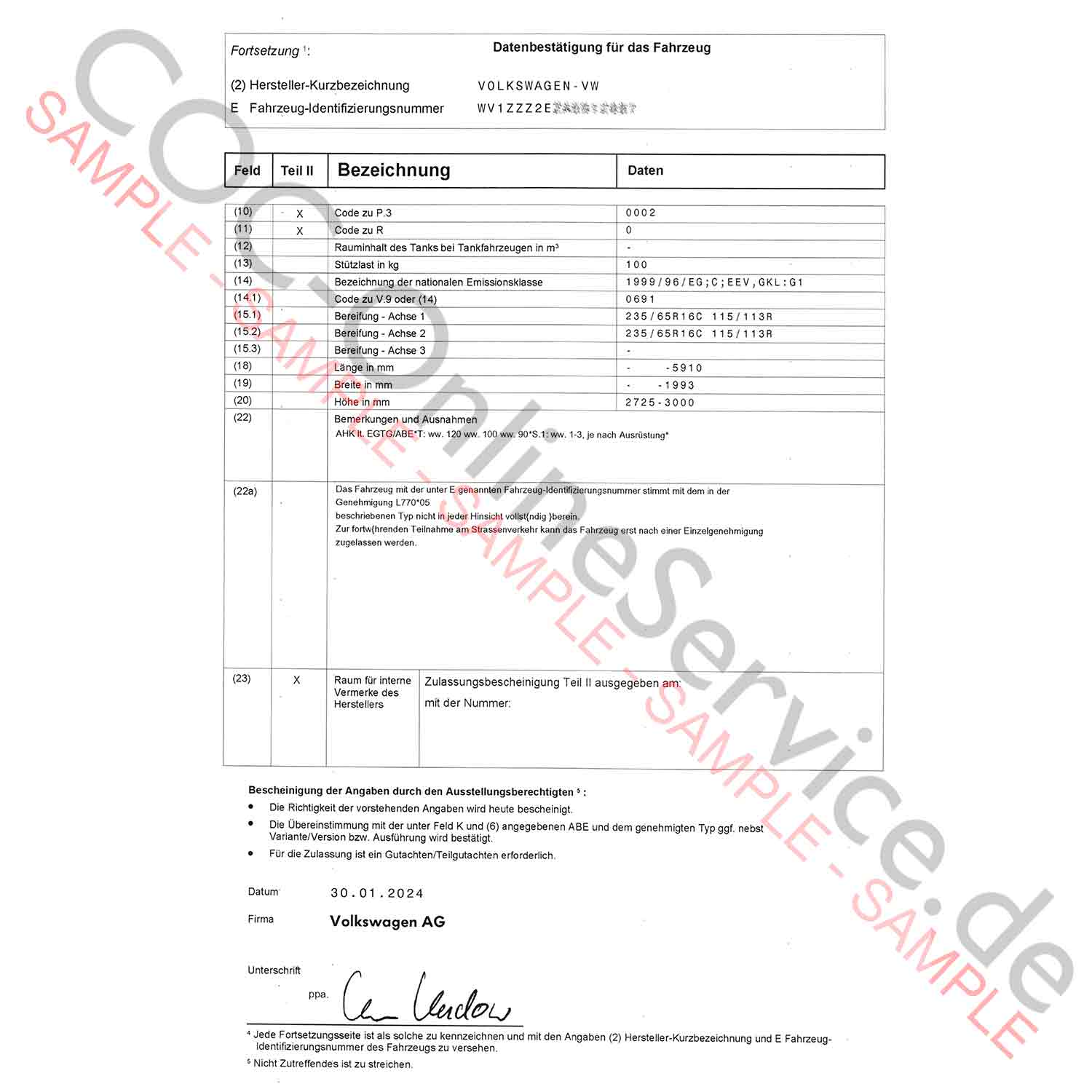Questa scheda tecnica per i marchi Volkswagen autovetture e veicoli commerciali ha lo scopo di supportare l'omologazione in Germania se il veicolo non è basato su un'omologazione CE e non può essere creato alcun COC.