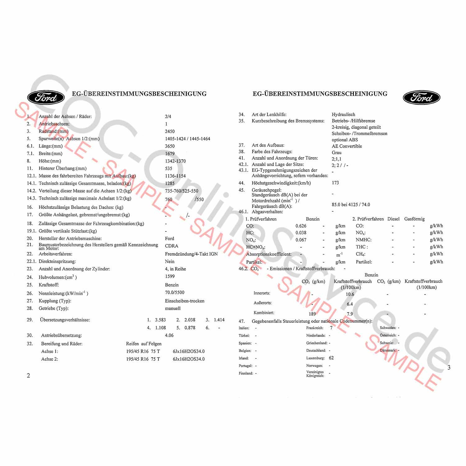 Sie erwerben ein authentisches Ford-Konformitätszertifikat (COC) ausgestellt vom Fahrzeughersteller Ford, das die Übereinstimmung Ihres Fahrzeuges mit den europäischen Normen bescheinigt. Mit diesem COC-Dokument können Sie ihr Fahrzeug in allen Ländern des Europäischen Wirtschaftsraums (EWR) offiziell zulassen.