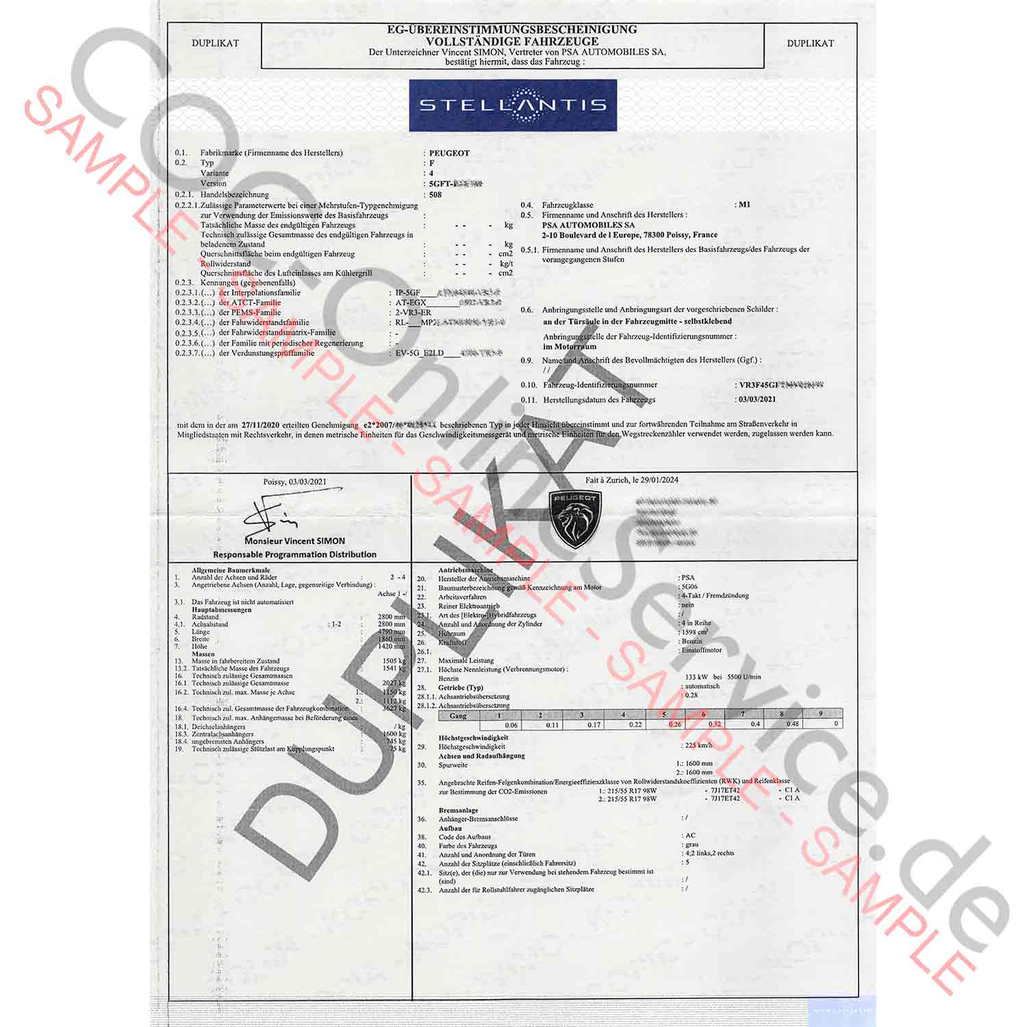 Sie erwerben ein authentisches Peugeot-Konformitätszertifikat (COC) ausgestellt vom Fahrzeughersteller Peugeot (Stellantis), das die Übereinstimmung Ihres Fahrzeuges mit den europäischen Normen bescheinigt. Mit diesem COC-Dokument können Sie ihr Fahrzeug in allen Ländern des Europäischen Wirtschaftsraums (EWR) offiziell zulassen.