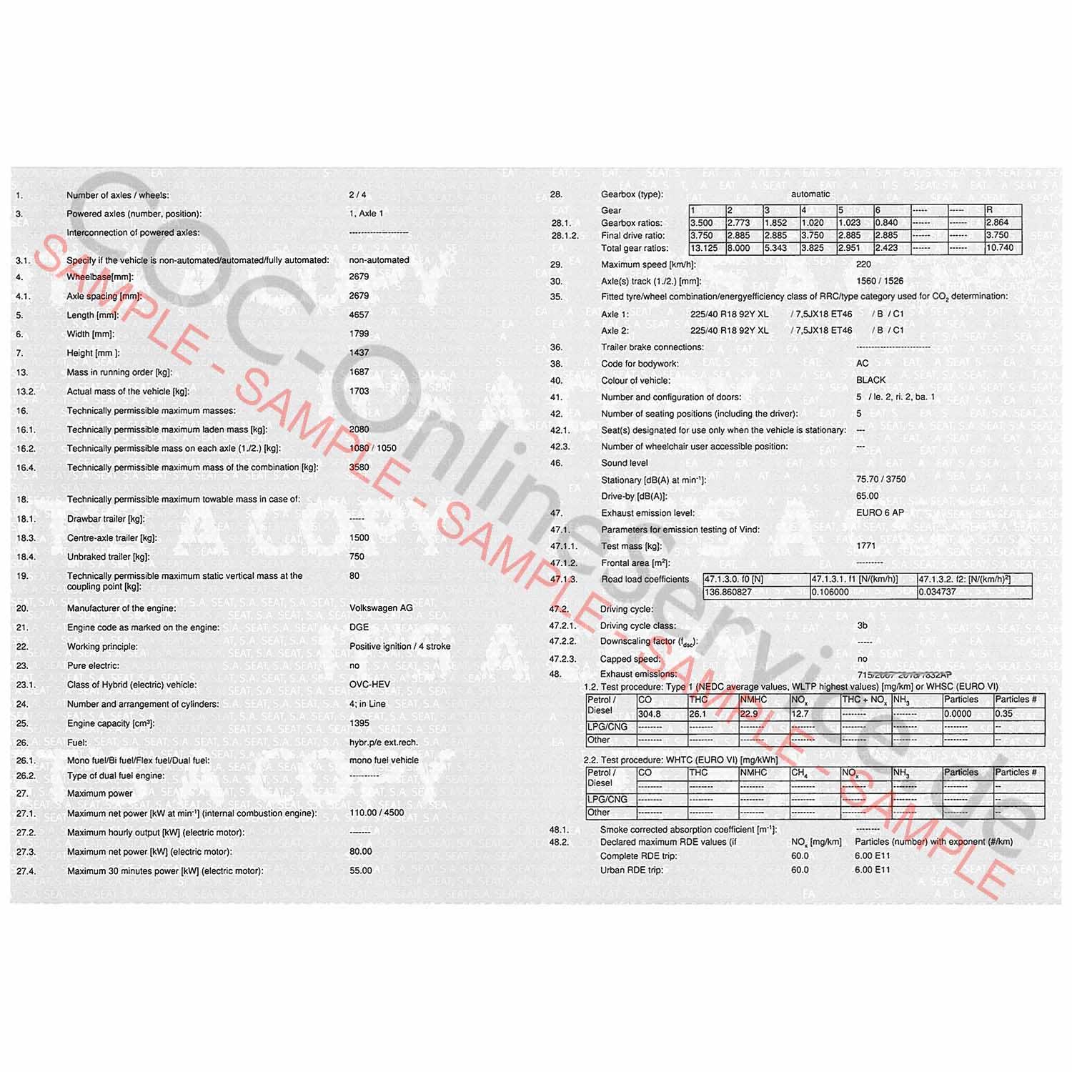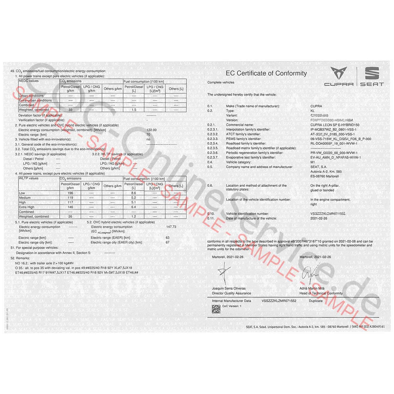 Adquire um certificado de conformidade autêntico da Cupra (COC) emitido pelo fabricante Seat Cupra S.A.U., que confirma a conformidade do seu veículo com as normas europeias. Com este documento COC, poderá matricular o seu veículo oficialmente em todos os países do Espaço Económico Europeu (EEE).